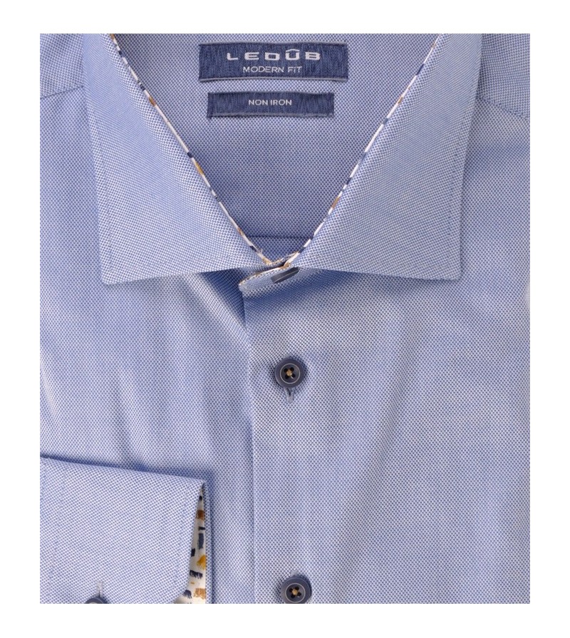 Lengtemaat Hemd extra lange mouw 76 cm tailored fit tot XXLT modern fit vanaf 3XLT zonder borstzakje met grijs accenten strijkvrij easy iron kent kraag subtiel motief sportief comfortabel 100%katoen 40°was kleur: blauw driehoekje