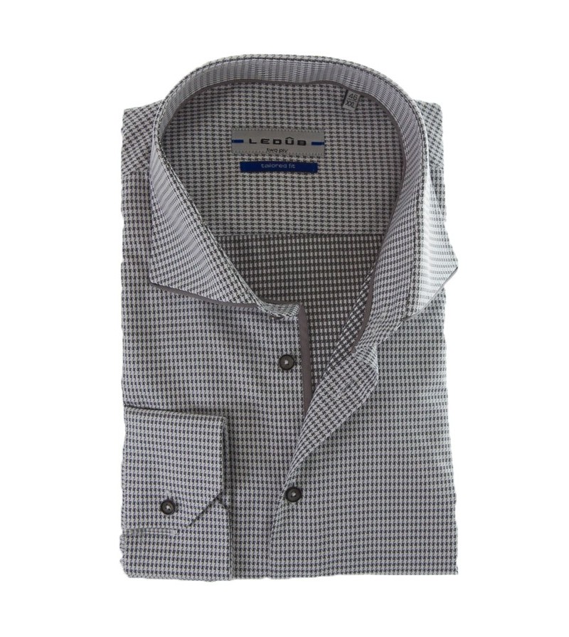 Lengtemaat Hemd extra lange mouw 76 cm tailored fit zonder borstzakje met grijs accenten strijkvrij easy iron kent kraag subtiel motief sportief comfortabel 100%katoen 40°was kleur: blauw met groen blaadje