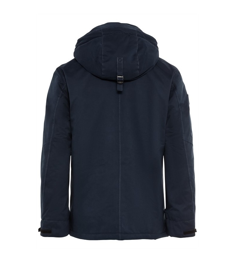 Lengtemaat Jas model: parka met afneembare kap armlengte 74 cm waterdicht ademend winddicht met windstopper in de mouwen mooi structuur in stof 2 zakken met rits 2 opgezette zakken kan voor nette en sportieve gelegenheid 2 binnen zakken 1 binnenzak 100%polyester 30°was kleur: navy