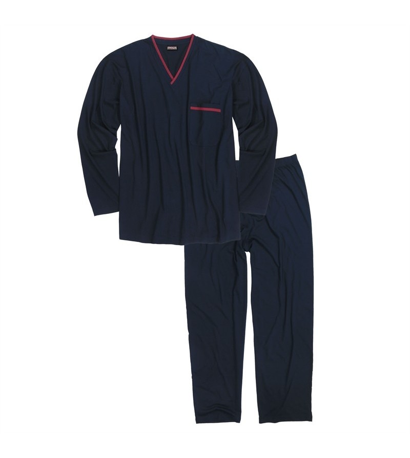 Pyjama lange broek bovenste met lange mouwen met elastieke band met achterzakje op broek met v-hals met touwtje in lenden zonder enkelboord, recht model fijne kwaliteit stretch stof jersey 100% katoen kleur: blauw en marine broek