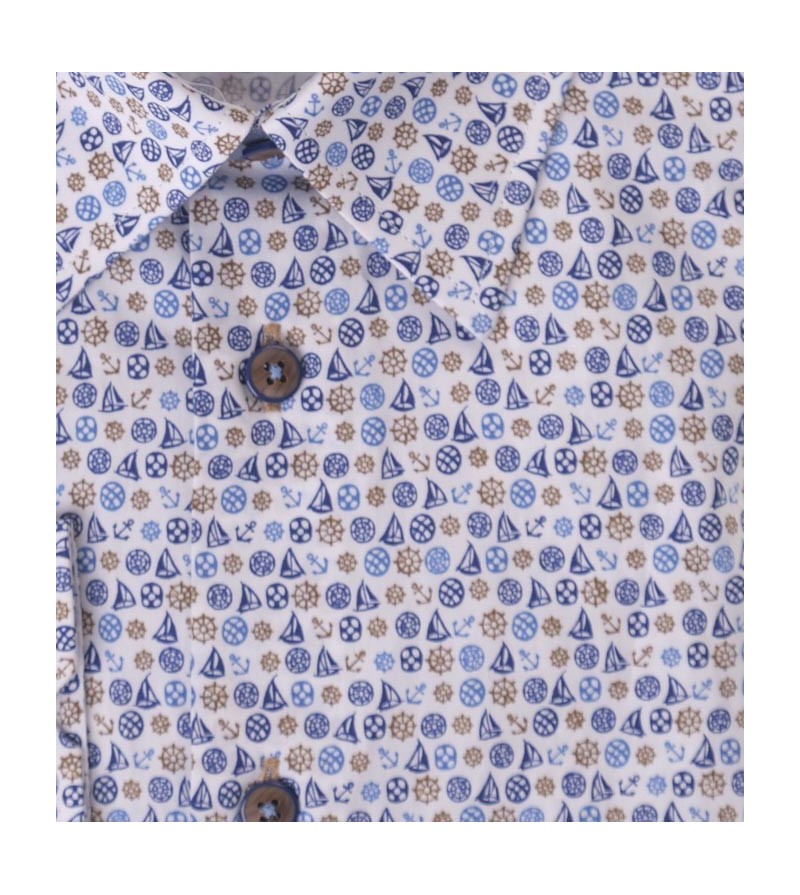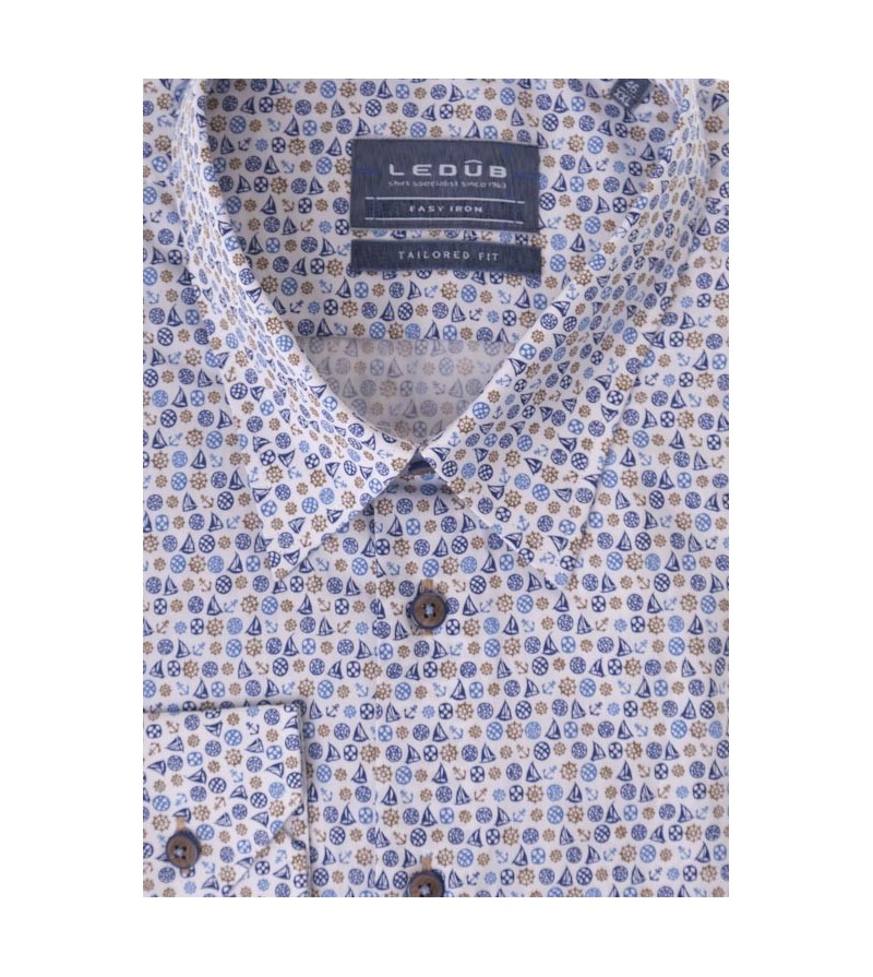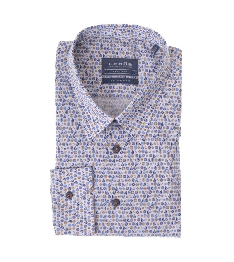 Tall Man Hemd tailored fit lange mouw 76 cm bruine knopen blauwe details stretch kent kraag easy iron netjes afgewerkt comfortabel leuk motief 97%katoen, 3%elasthaan 40°was kleur: wit