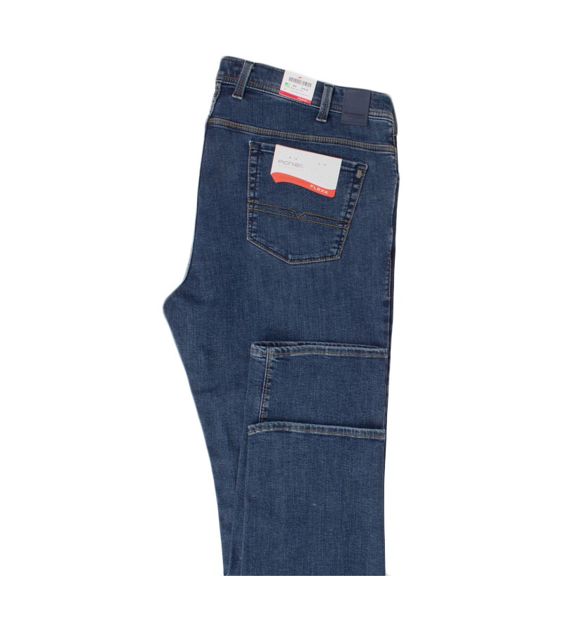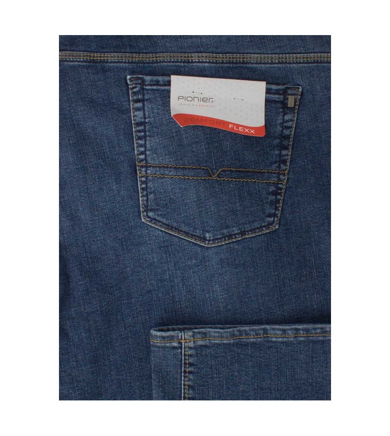 Pioneer comfort flexx 2079 6185 61 extra lage taille mooie kleurschakering met bruine stiksels stoere canvas stof model: Thomas 98%katoen 2%elasthan strakker op de bovenbenen regular fitting cleane wassing kleur: dark stone washed