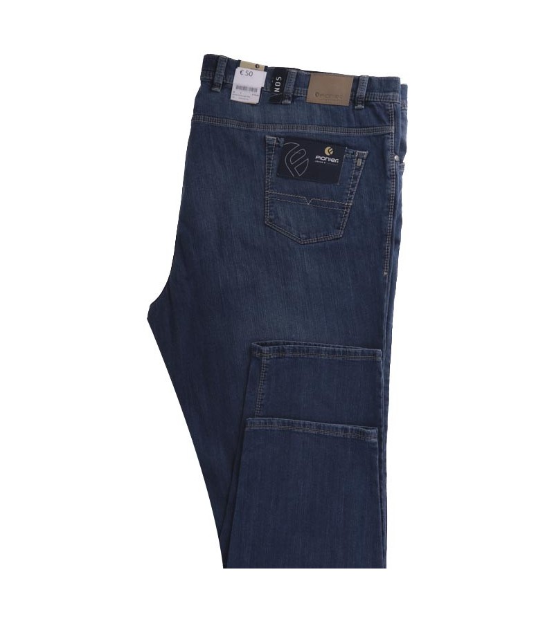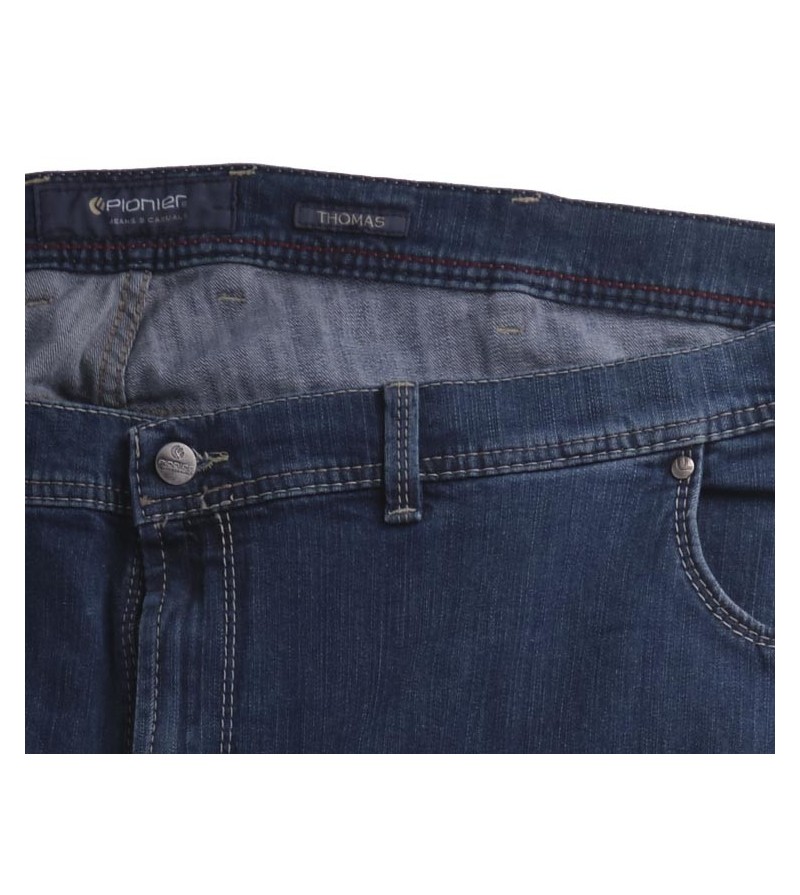 Pioneer comfort flexx 2079 6185 61 extra lage taille mooie kleurschakering met bruine stiksels stoere canvas stof model: Thomas 98%katoen 2%elasthan strakker op de bovenbenen regular fitting cleane wassing kleur: dark stone washed