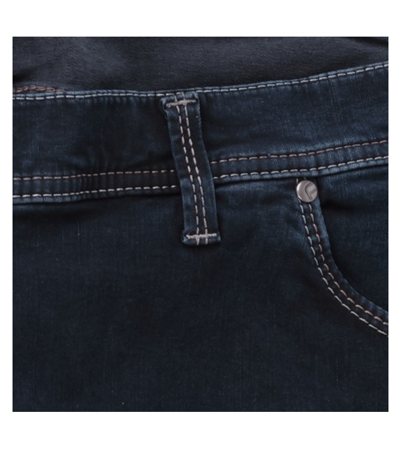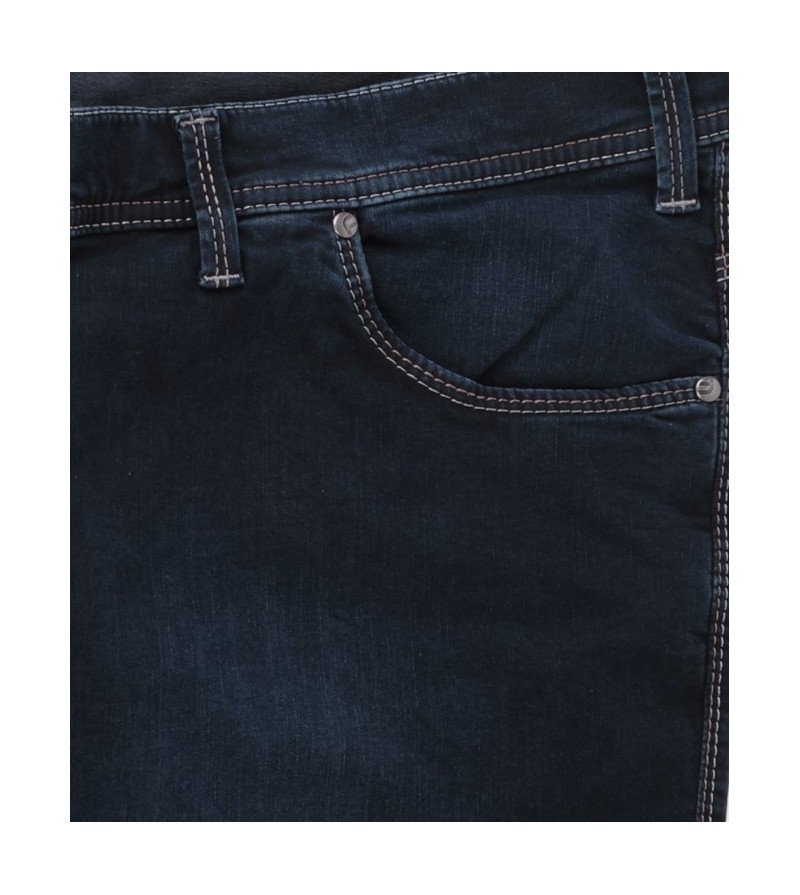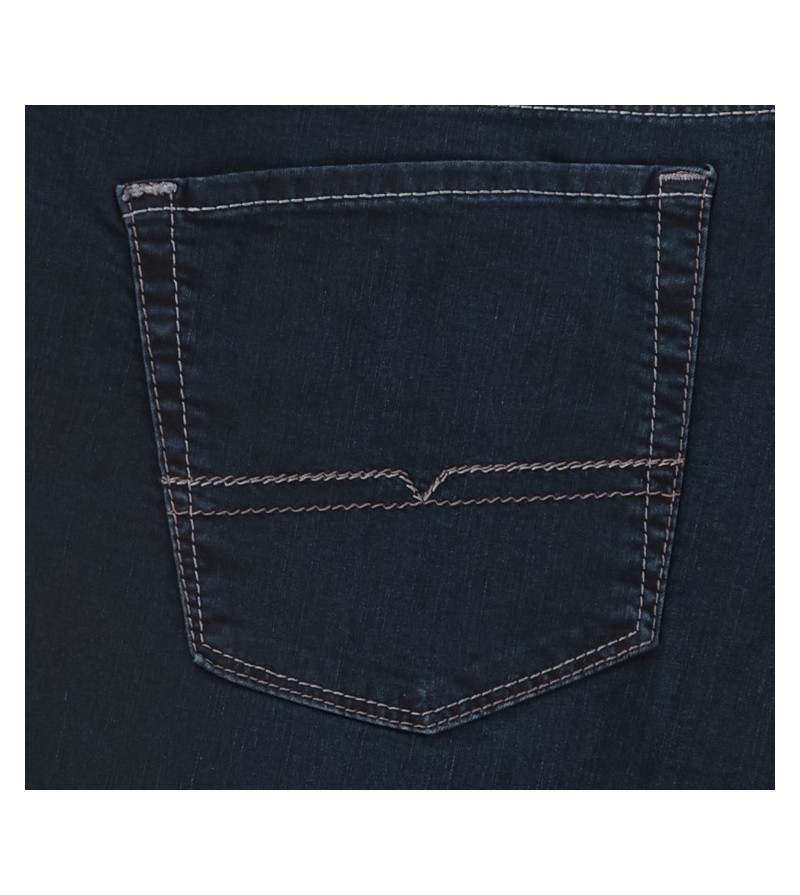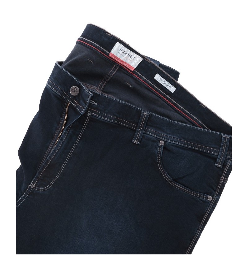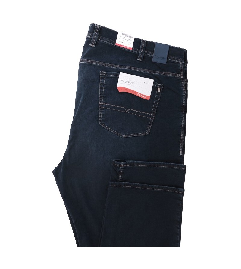 Pioneer comfort flexx 2079 6185 61 extra lage taille mooie kleurschakering met bruine stiksels stoere canvas stof model: Thomas 98%katoen 2%elasthan strakker op de bovenbenen regular fitting cleane wassing kleur: dark stone washed