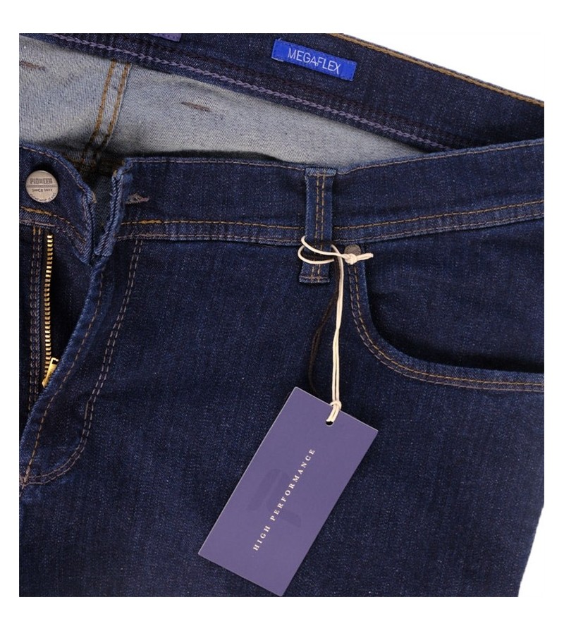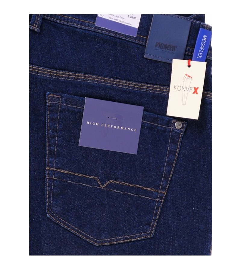 Pioneer comfort flexx 2079 6185 61 extra lage taille mooie kleurschakering met bruine stiksels stoere canvas stof model: Thomas 98%katoen 2%elasthan strakker op de bovenbenen regular fitting cleane wassing kleur: dark stone washed