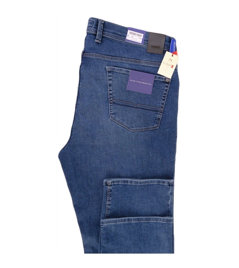 Pioneer comfort flexx 2079 6185 61 extra lage taille mooie kleurschakering met bruine stiksels stoere canvas stof model: Thomas 98%katoen 2%elasthan strakker op de bovenbenen regular fitting cleane wassing kleur: dark stone washed