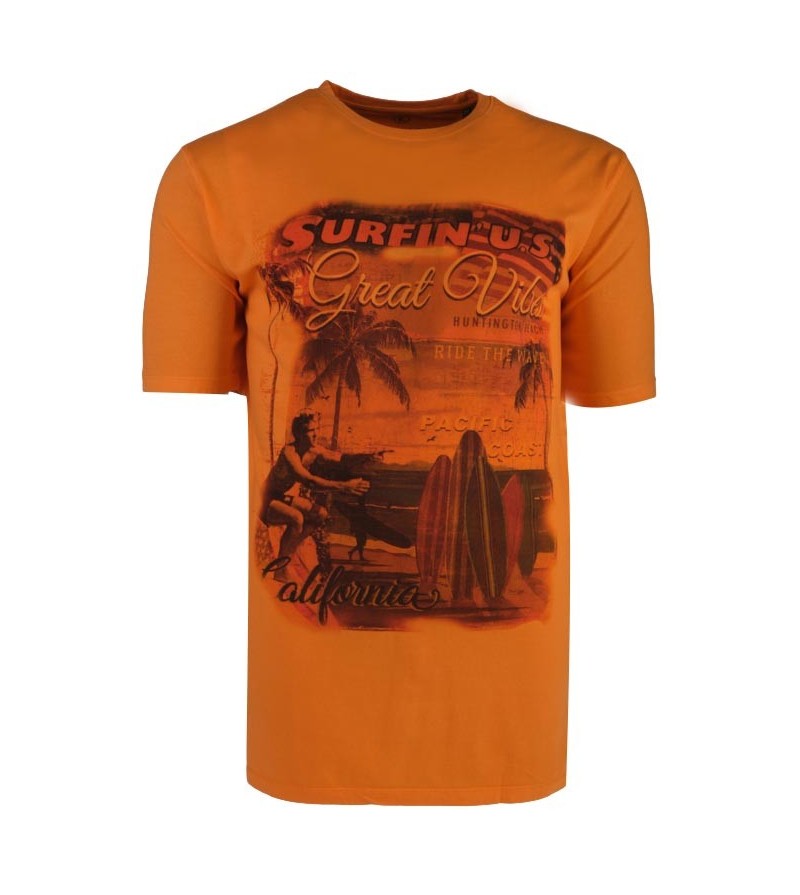 Tall Man Tshirt korte mouwen ronde hals comfortabel kwaliteit netjes afgewerkt goede pasvorm zomerse kleur sportieve look mooie opdruk 100%katoen 30°Was kleur : oranje